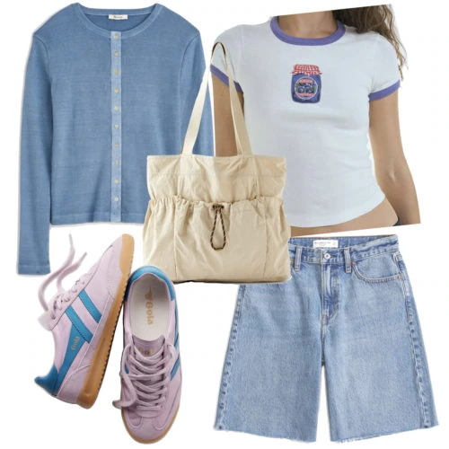 Products: Cardigan, T-Shirt, Shorts, Bag, Sneakers